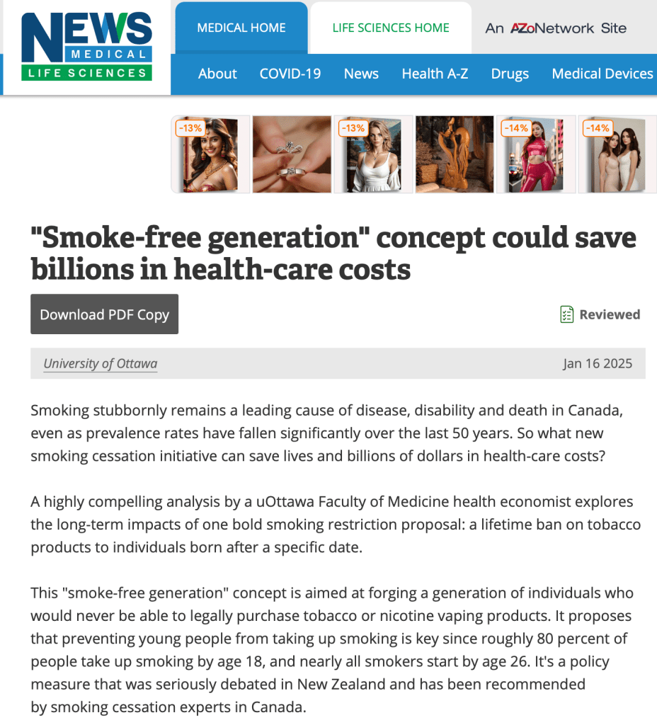 Dr. Doug Coyle suggests that if the Canadian government were to implement a “smoke-free generation” policy there would be massive health benefits. His study estimates that the policy would result in $2.3 billion less in health care costs and lead to 476,814 more quality-adjusted life years for Canadians over a 50-year timespan.