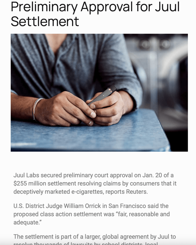 The recent class action settlement resolves claims by people who say they would have paid less, or not bought the e-cigarettes at all, if Juul had not downplayed the products’ addictiveness and appealed to teenagers through social media campaigns and other means.