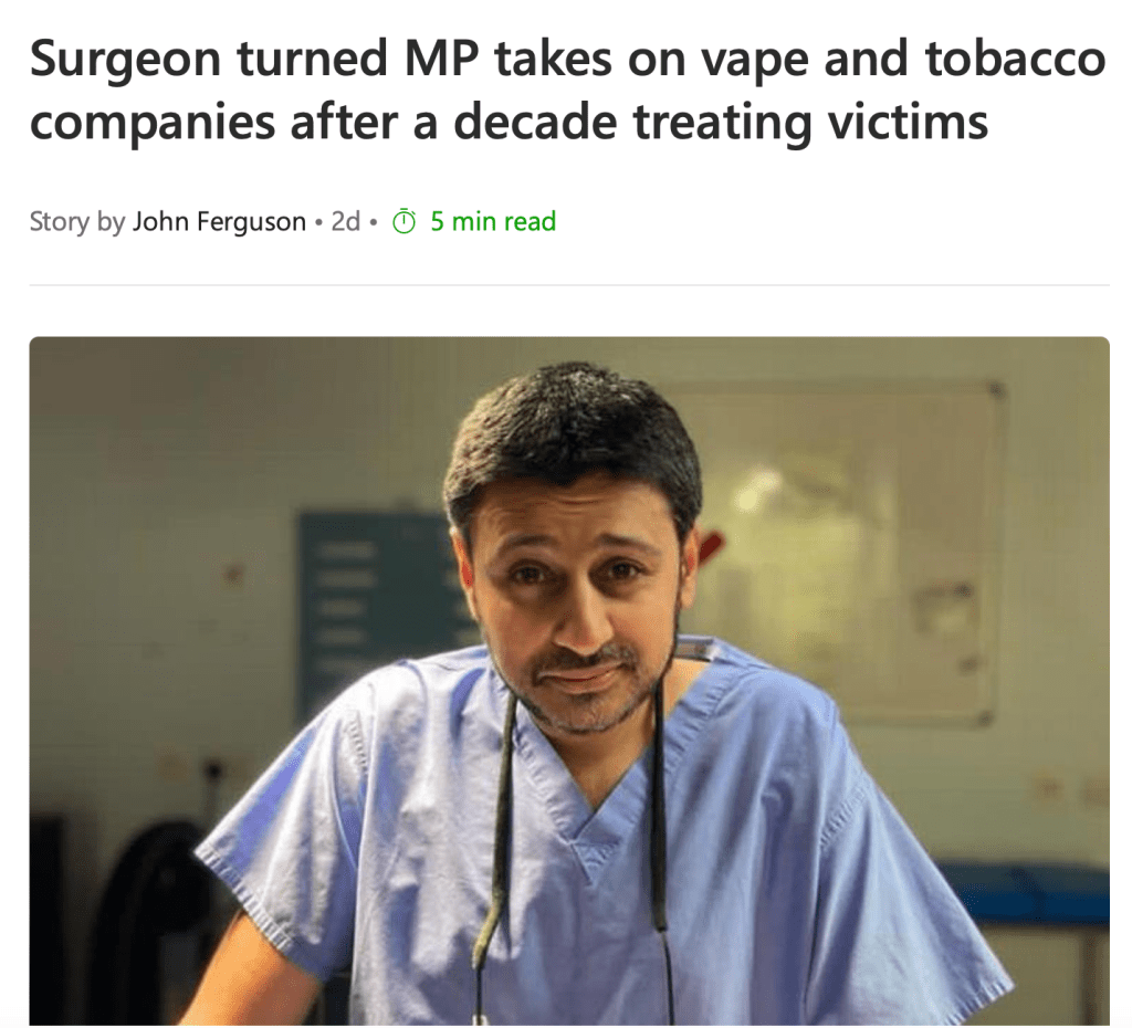 “I have spent the last three weeks in the Tobacco and Vapes Bill committee scrutinising legislation that will see every child born after 1 st January 2009 never being allowed to smoke and will further control the sale of vapes, particularly those targeted at children.