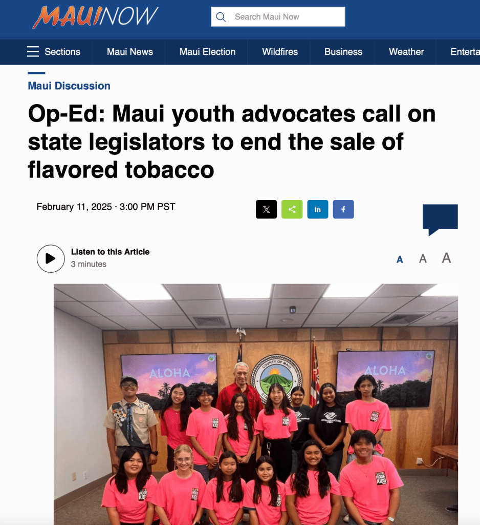 Over the years, youth like us have played a significant role in passing tobacco control policies. This past year, youth helped lead the way in the City and County of Honolulu, Hawaiʻi County and most recently, Maui County, to pass bills to end the sale of flavored tobacco products. We hope Kauaʻi will soon follow. We want to ensure all counties in Hawaiʻi have the authority to pass regulations tailored to their communities’ needs if the legislature does not end the sale of flavored tobacco at the state level.